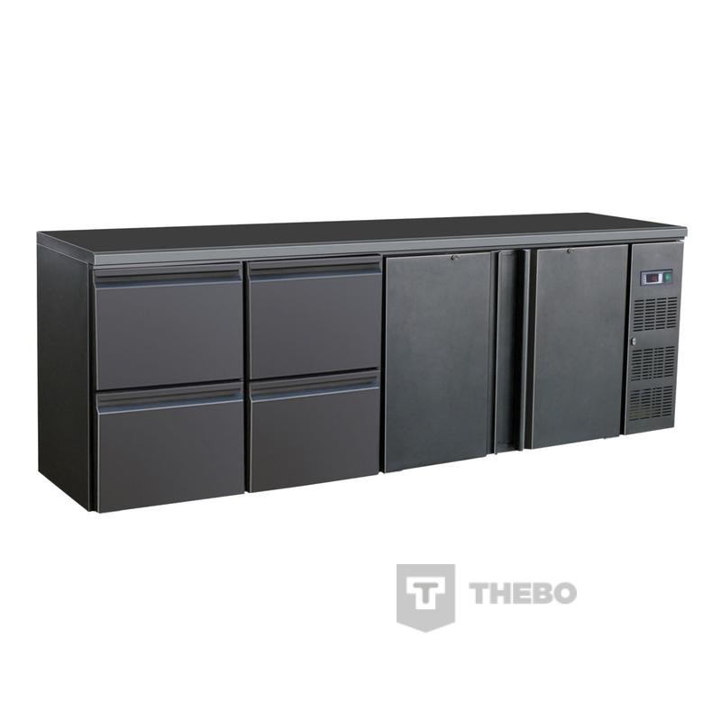 Merk Combisteel Garantie 2 jaar Gewicht 150 kg Inhoud 698 L Materiaal uitwendig Gecoat plaatstaal Max. omgevingstemperatuur 32 °C Temperatuur 0/+10 °C Temperatuurregeling Digitaal Aansluitspanning 230V Slot Ja Aantal lades 4 Aantal deuren 2 Kleur uitwendig Zwart Afmetingen