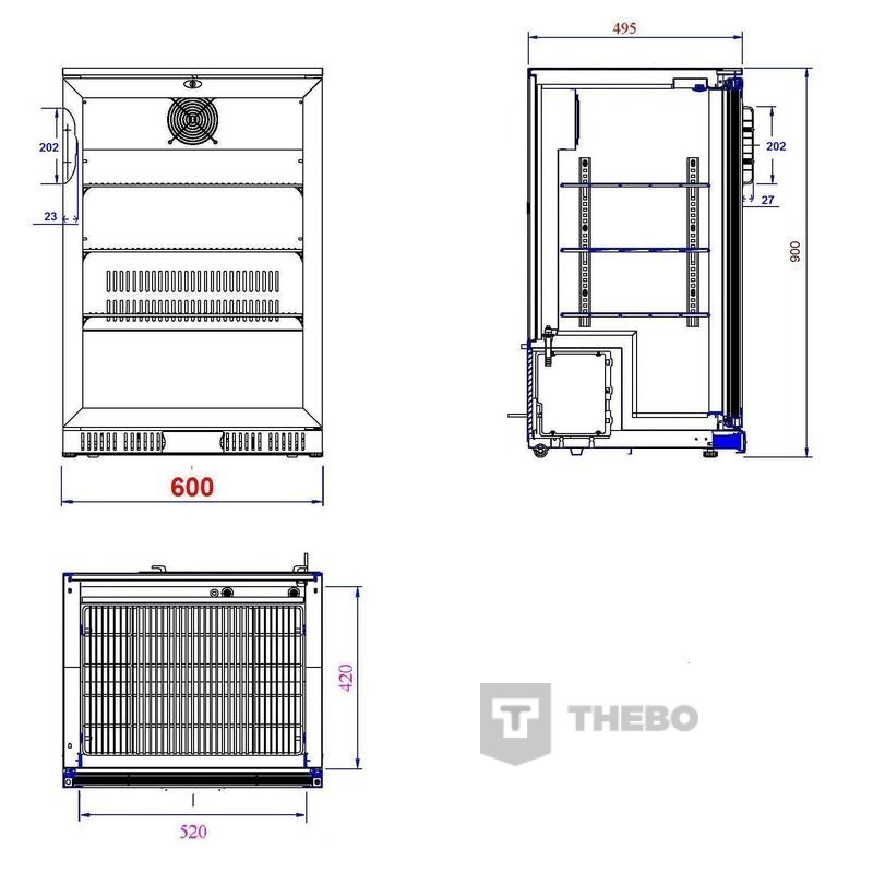 BxDxH 600x520x900 mm Breedte uitwendig 600 mm Diepte uitwendig 520 mm Hoogte uitwendig 900 mm Interieurbreedte 520 mm Interieurdiepte 385 mm Interieurhoogte 750 mm Isolatiedikte 40 mm Specifieke eigenschappen