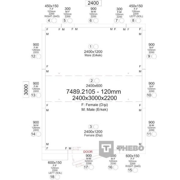BxDxH 2400x3000x2200 mm Breedte uitwendig 2400 mm Diepte uitwendig 3000 mm Hoogte uitwendig 2200 mm Interieurbreedte 2160 mm Interieurdiepte 2760 mm Interieurhoogte 1960 mm Deurbreedte 700 mm Deurhoogte 1765 mm Isolatiedikte 120 mm Specifieke eigenschappen