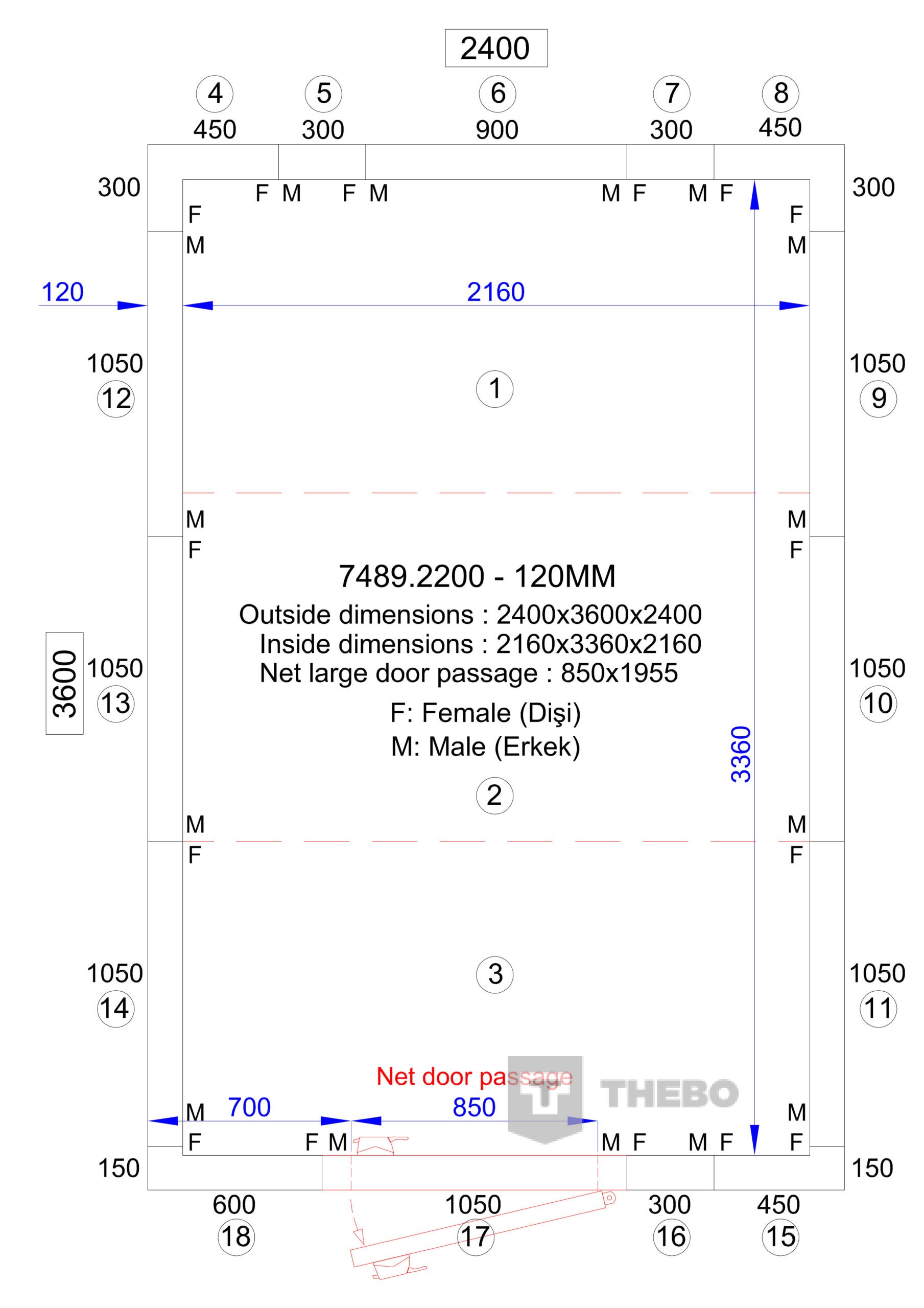 BxDxH 2400x3600x2400 mm Breedte uitwendig 2400 mm Diepte uitwendig 3600 mm Hoogte uitwendig 2400 mm Interieurbreedte 2160 mm Interieurdiepte 3360 mm Interieurhoogte 2160 mm Deurbreedte 850 mm Isolatiedikte 120 mm Specifieke eigenschappen