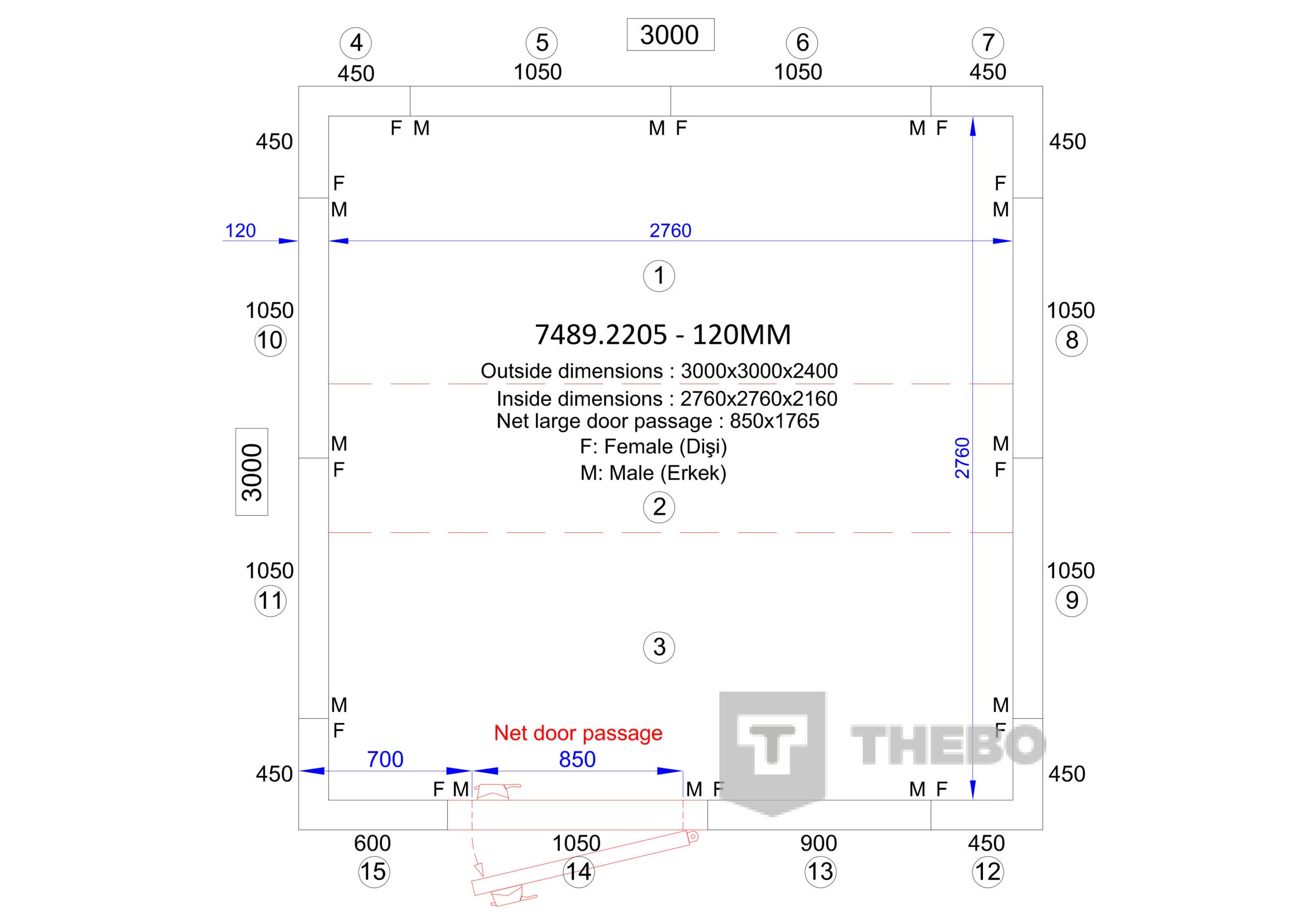 BxDxH 3000x3000x2400 mm Breedte uitwendig 3000 mm Diepte uitwendig 3000 mm Hoogte uitwendig 2400 mm Interieurbreedte 2760 mm Interieurdiepte 2760 mm Interieurhoogte 2160 mm Deurbreedte 700 mm Isolatiedikte 120 mm Specifieke eigenschappen