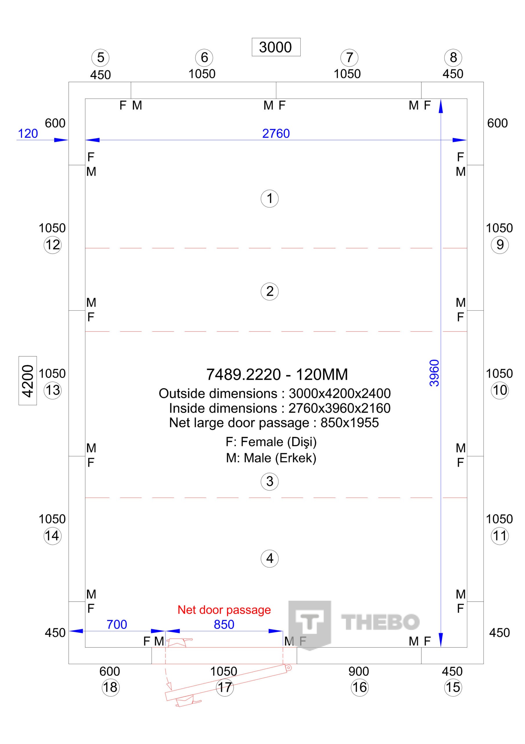 Diepte uitwendig 4200 mm Hoogte uitwendig 2400 mm Interieurbreedte 2760 mm Interieurdiepte 3960 mm Interieurhoogte 2160 mm Deurbreedte 700 mm Isolatiedikte 120 mm Specifieke eigenschappen