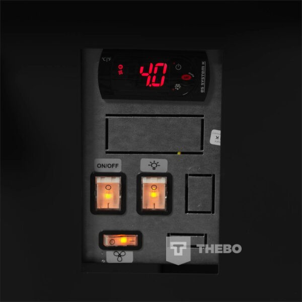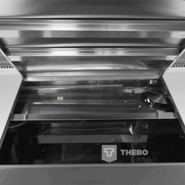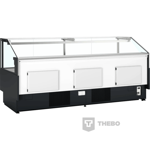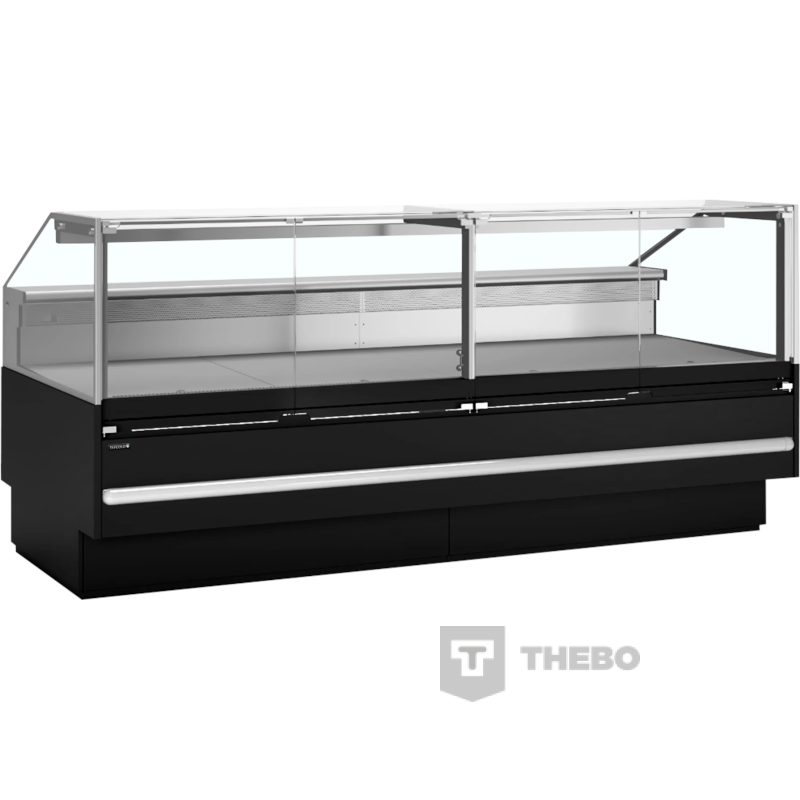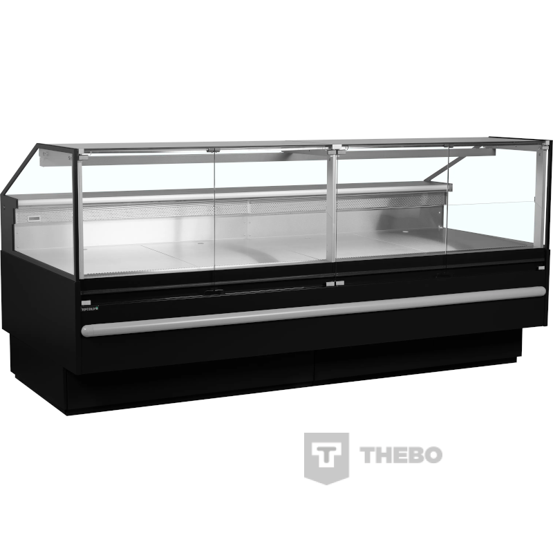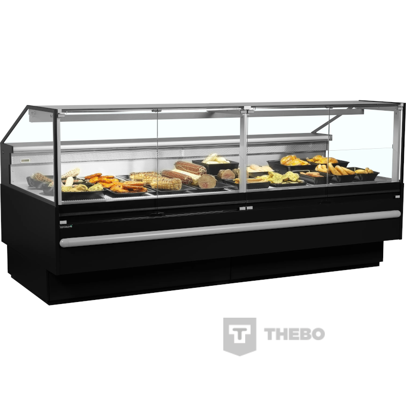 De Tefcold SOCB25082B is een zwarte koeltoonbank met een etaleeroppervlak van 2.29 m², gemaakt voor het overzichtelijk presenteren en koelen van vlees, kaas en delicatessen. De binnenzijde van de koeltoonbank is vervaardigd uit roestvrij staal, het materiaal van de buitenzijde is gemaakt van gecoat plaatstaal. De toonbank maakt gebruik van een geforceerd koelsysteem dat ervoor zorgt dat de temperatuur gelijkmatig verdeeld is. Ook maakt de koeltoonbank gebruik van het milieuvriendelijke koudemiddel R290. De Tefcold SOCB25082B heeft een instelbaar temperatuurbereik van 0 tot +4°C, die makkelijk te regelen is via het digitale temperatuurdisplay. De koeltoonbank is voorzien van automatische ontdooiing en LED-verlichting. Onder het etaleervak bevindt zich een ruim opbergvak met drie brede deuren.