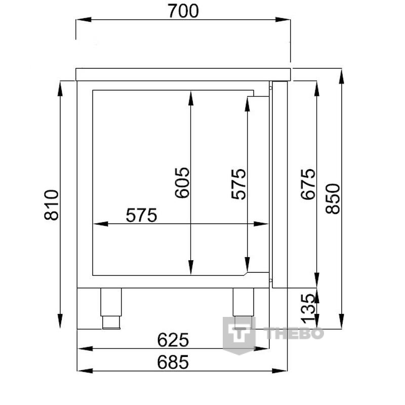 BxDxH 1400x700x850 mm Breedte uitwendig 1400 mm Diepte uitwendig 700 mm Hoogte uitwendig 850 mm Isolatiedikte 50 mm Bladdikte 40 mm Maatsysteem 1/1 Gastronorm Hoogte poten 135-195 mm Specifieke eigenschappen