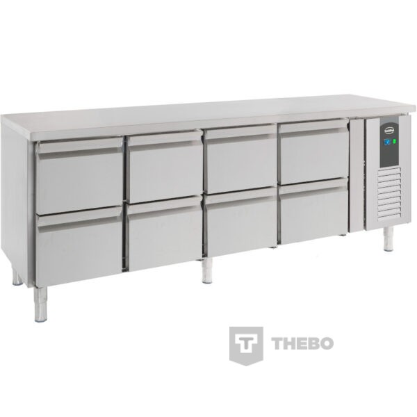 De Combisteel 7950.0235 is een koelwerkbank met acht laden, uitgevoerd in roestvrij staal. Het apparaat beschikt over een automatisch ontdooisysteem en werkt met het koudemiddel R600a. De temperatuur is digitaal af te lezen op het display. Door de geforceerde koeling blijft de temperatuur gelijkmatig verdeeld. Deze koelwerkbank biedt zowel koelopslag als een werkblad en is geschikt voor gebruik in professionele keukens.