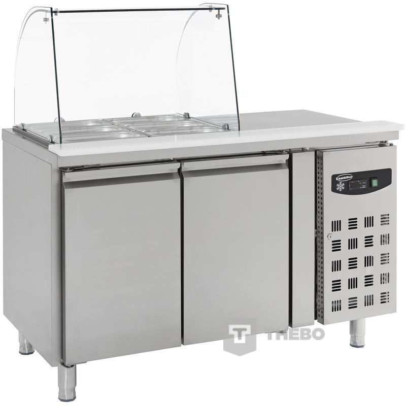 De 7950.0410 is een tweedeurs koelwerkbank met glasopstand van Combisteel. Het temperatuurbereik van deze kast ligt tussen de +2 en +8°C. Deze werkbank wordt standaard geleverd met twee 1/1 GN roosters. De kasten van deze werkbank worden geforceerd gekoeld, wat ervoor zorgt dat de temperatuur constant en gelijkmatig is. Dit koelsysteem werkt samen met het duurzame koudemiddel R600A. De behuizing van de 7950.0410 is compleet vervaardigd uit RVS.