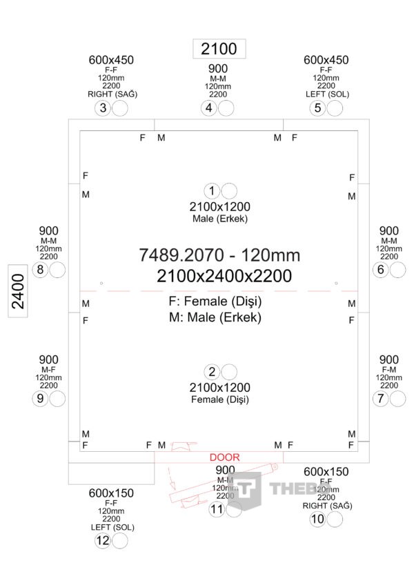 BxDxH 2100x2400x2200 mm Breedte uitwendig 2100 mm Diepte uitwendig 2400mm Hoogte uitwendig 2200 mm Interieurbreedte 1860 mm Interieurdiepte 2160 mm Interieurhoogte 1960 mm Deurbreedte 700 mm Deurhoogte 1765 mm Isolatiedikte 120 mm Afmetingen motor bxdxh 785x835x767 mm Specifieke eigenschappen