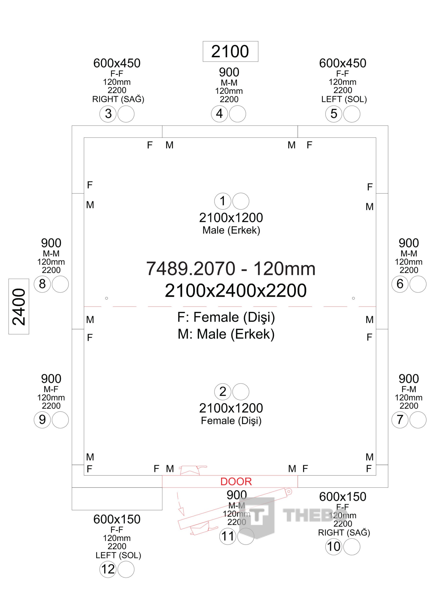 BxDxH: 1200x1200x2060 mm