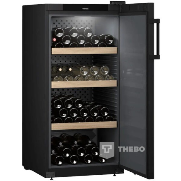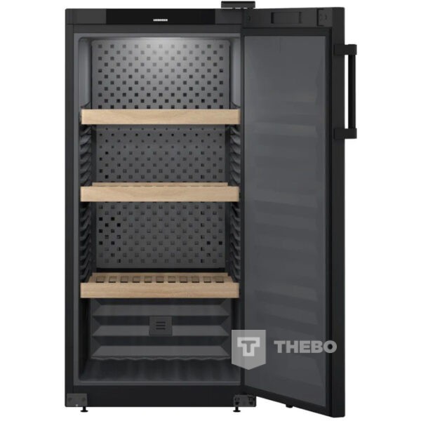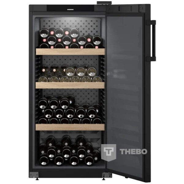 De Liebherr WSbl 4201-20 is een wijnkoelkast met één temperatuurzone en digitale regeling tussen +5°C en +20°C. Het interieur is uitgevoerd in ABS en voorzien van LED-verlichting, wat overzichtelijke opslag van vier roosters of platen mogelijk maakt. Met een interne hoogte van 1070 mm en een diepte van 573 mm biedt deze koelkast voldoende ruimte voor een compacte wijncollectie. De omkeerbare deur, wielen en stelpoten maken plaatsing en verplaatsing flexibel. De WSbl 4201-20 werkt met het milieuvriendelijke koudemiddel R600a en heeft energieklasse D. Optioneel kan een slot worden toegevoegd voor extra beveiliging.